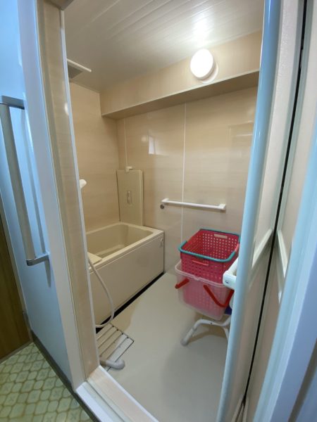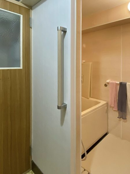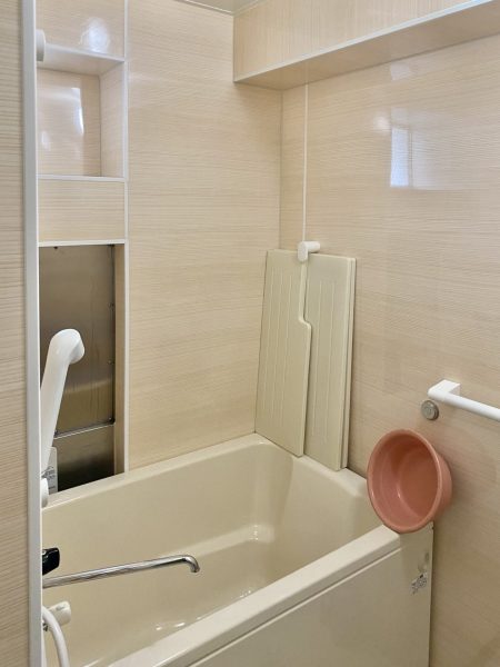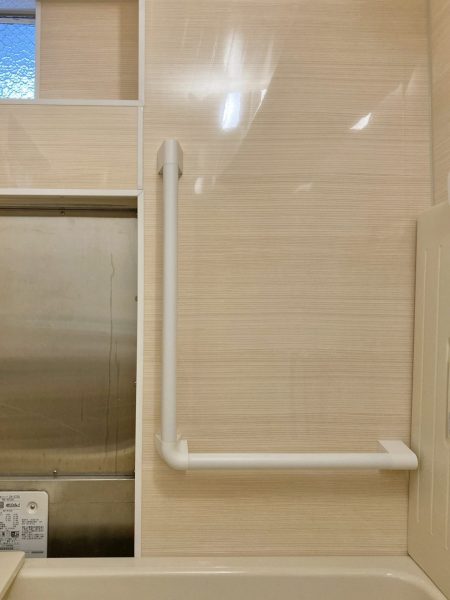 また、介護保険を活用し、浴室内外に手すりを設置するとともに、出入口の段差を軽減し、浴室床には滑りにくい仕様を採用しました。日々の動作がスムーズになり、転倒の不安を軽減できる、安心・安全な浴室となっています。