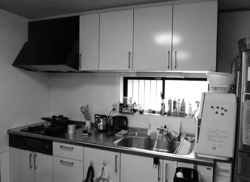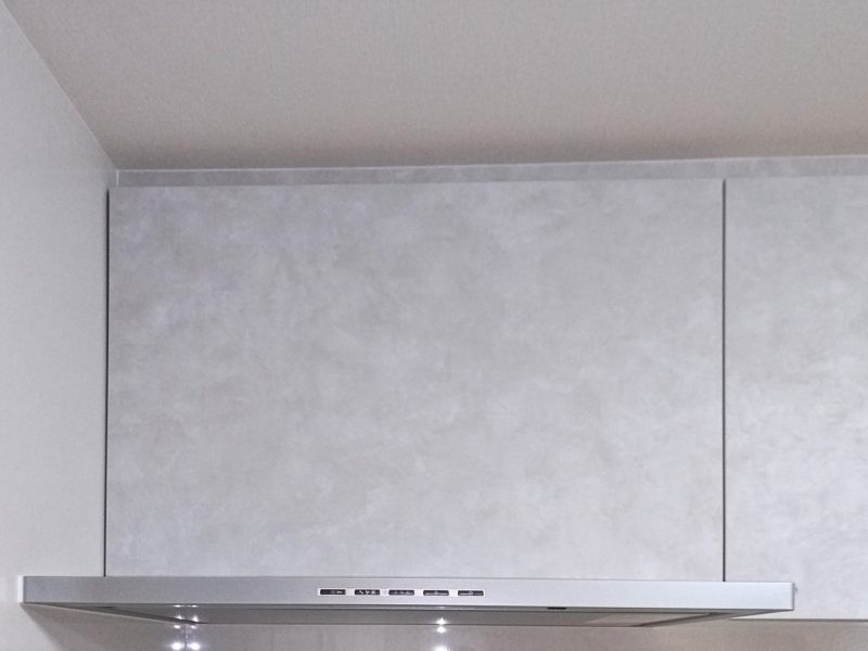 モノトーンの旧キッチンから、明るいライトグレーの扉カラーへ変更し、