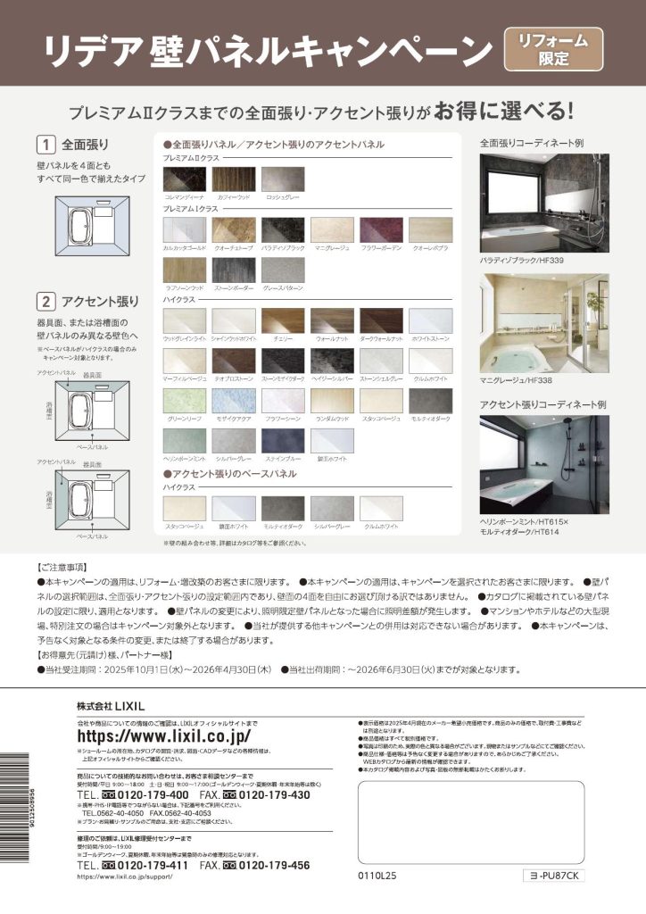 2025年10月1日(水)から2026年3月31日(火)までの期間限定で、LIXILの人気システムバスルーム 「リデア」 が対象の 壁パネルキャンペーン が開催されます。